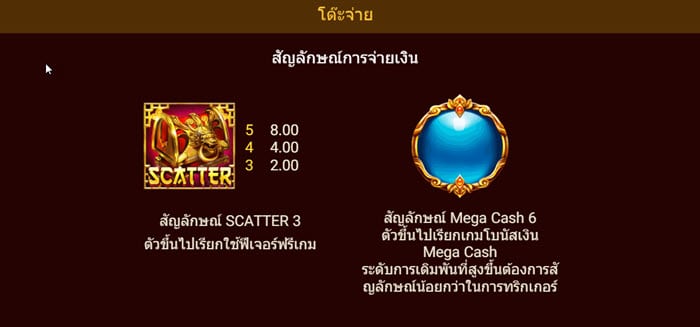 - Mega Cash Bonus Game สามารถทริกเกอร์ระหว่างฟรีเกมส์และจะเล่นก่อนฟรเกมส์จะเล่นต่อ